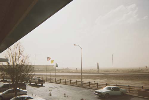 The wind is picking up, and out of the west the horizon is slightly rusty pink. There's a dust storm on the way.
